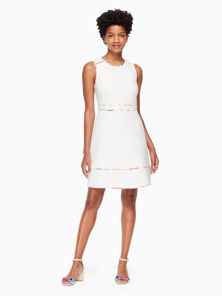 from the cobblestone streets of charleston to the avenues of new york, a tweed dress belongs in the wardrobe of every well-dressed woman. this classic number is updated with bold floral piping for a distinctly modern edge.