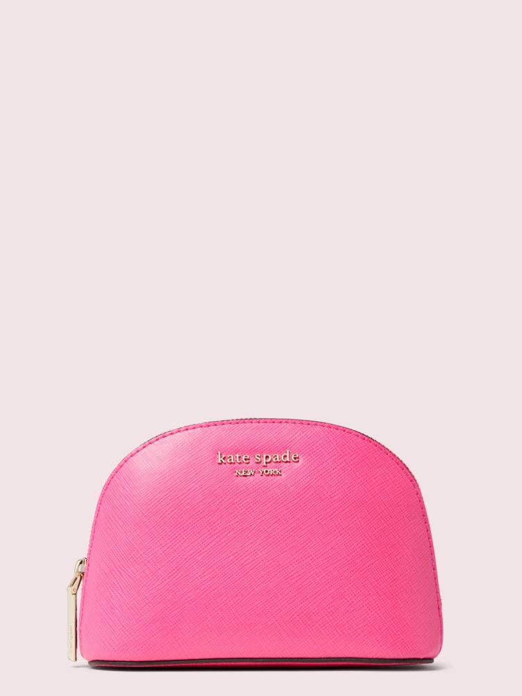 our spencer small dome cosmetic case is done in our new saffiano leather. its soft texture is nice to touch and durable against drops and scratches so it'll keep its sleek, luxe look.